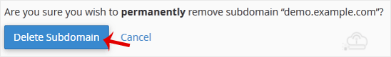 5. For confirmation, click on Delete Subdomain to remove your subdomain permanently.
